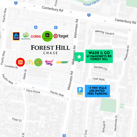 Our laundry is opposite Forest Hill Chase Shopping Centre on Mahoneys Rd (near Canterbury Rd). There is free parking available in front, with easy access to Woolworths, Coles, Aldi, Harris Scarfe, and many cafes and restaurants.